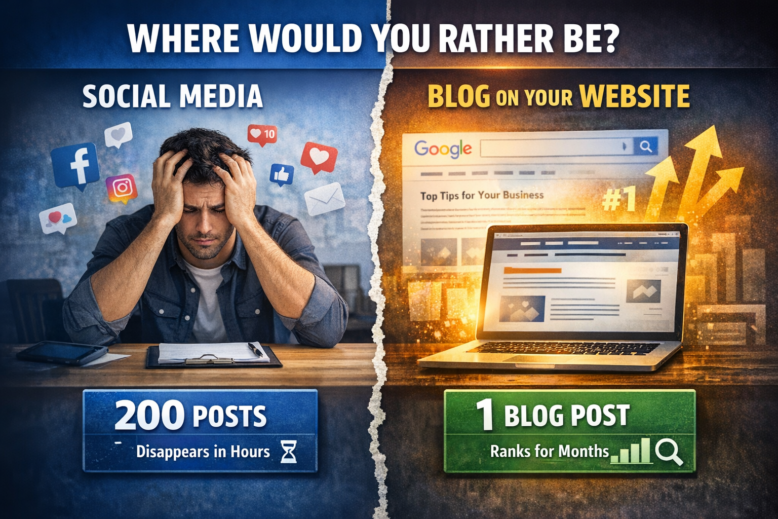 Keep posting on social media if it's working for your audience. But if you're only doing social and your website has no blog, you're running on a treadmill with no finish line. Every post you publish disappears within a day, and you start again tomorrow with nothing to show for yesterday's effort.